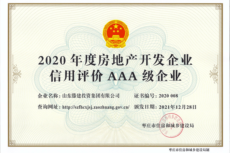 近期,棗莊市住房和城鄉(xiāng)建設局發(fā)布了2020年度全市房地產(chǎn)開發(fā)企業(yè)信用等級評定結果。山東滕建投資集團有限公司憑借在企業(yè)客觀信用能力、經(jīng)營信用情況、社會信用等方面出色的綜合實力,榮獲2020年AAA級房地產(chǎn)開發(fā)企業(yè)最高信用等級。房地產(chǎn)開發(fā)企業(yè)信用評定是棗莊市住房和城鄉(xiāng)建設局依據(jù)《棗莊市房地產(chǎn)開發(fā)企業(yè)信用評價實施細則